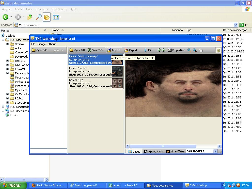 Now get one txd file, and import your textures, don't forget to rename it to the exaclty name that you used before import them into 3dsmax!