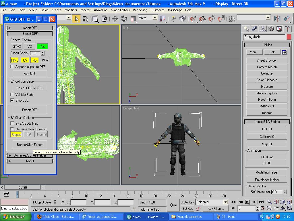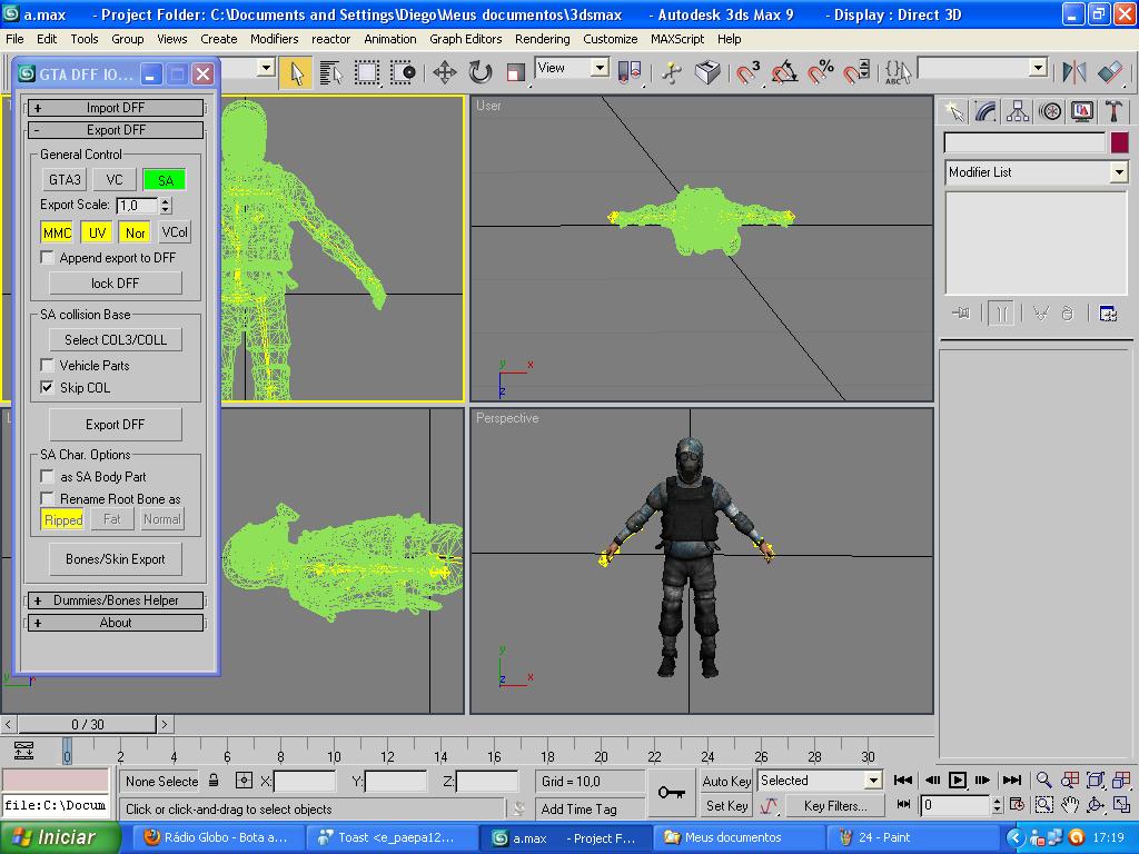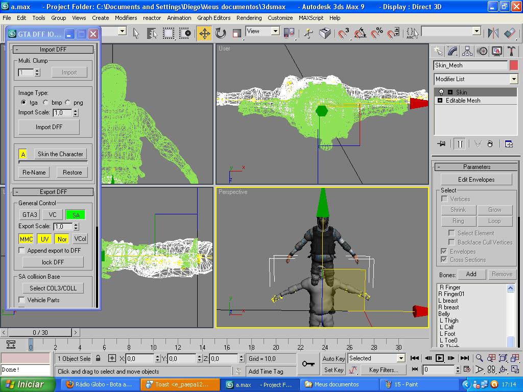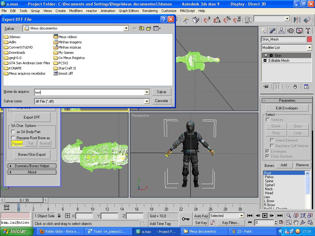 ResponderExcluirHave you ever rigged a skin, loaded it up on GTA SA, only to crash the game? I made sure the output from 3DS MAX is a valid DFF file. I tried exporting and importing it back and it's still fine. Also, I used DFF Viewer and opened the output--it's also working.